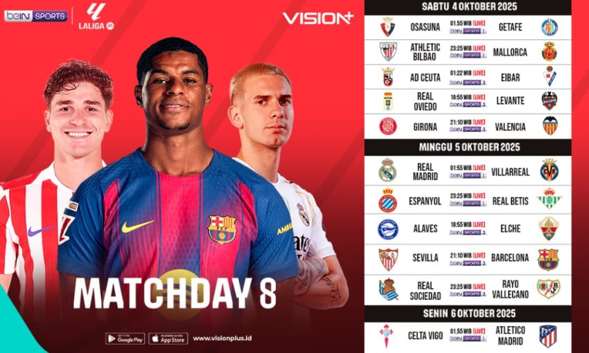 loading… LaLiga 2025/26 kembali hadir di Matchday 8 dengan deretan laga menarik yang dapat disaksikan melalui VISION+ dengan klik di sini. Pekan ini, sorotan utama tertuju pada duel panas antara Sevilla vs Barcelona serta laga Real Madrid vs Villarreal yang diprediksi menghadirkan laga yang seru. Selain itu, tim-tim seperti Barcelona, juga akan berjuang demi posisi […]